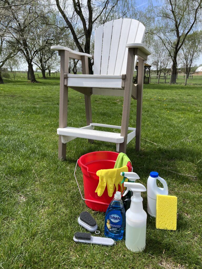 This is one of poly furniture’s most practical advantages. Routine cleaning requires nothing more than soap and warm water. For tougher stains including bird droppings, tree sap, or mildew, a mild bleach solution or a cleaner like Simple Green works effectively. Because the non-porous surface of HDPE poly lumber does not absorb stains, cleanup is pretty low maintenance!